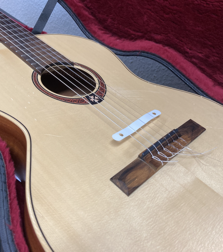 Heute gab es noch einen lustigen Zufall. Irgendjemand hat einen Streifen aus einem Hefter vergessen, der lag nun neben dem Notenständer ein paar Stunden später nahm eine Schülerin den Streifen und steckte es zwischen die Saiten ihrer Gitarre. Sie präparierte ihr Instrument, im Endeffekt wie John Cage. Ich probierte das auch sofort aus und es klang erstaunlich gut. Wenn man den Streifen nahe am Steg befestigte wurden die Saiten nur ein wenig gedämpft. Je näher man es jedoch in Richtung Schalloch bewegte desto krasser wurde der Effekt. Es entstehen teilweise Sounds, die sehr obertonreich sind oder aber in Richtung Ringmodulation gehen. Ein günstiges Effektgerät für akustische Gitarren um neue Sounds zu erzeugen. Vielleicht könnte man noch unterschiedlich Materialien, Befestigungsweisen oder Formen ausprobieren, um noch mehr neue Klänge zu erzeugen.